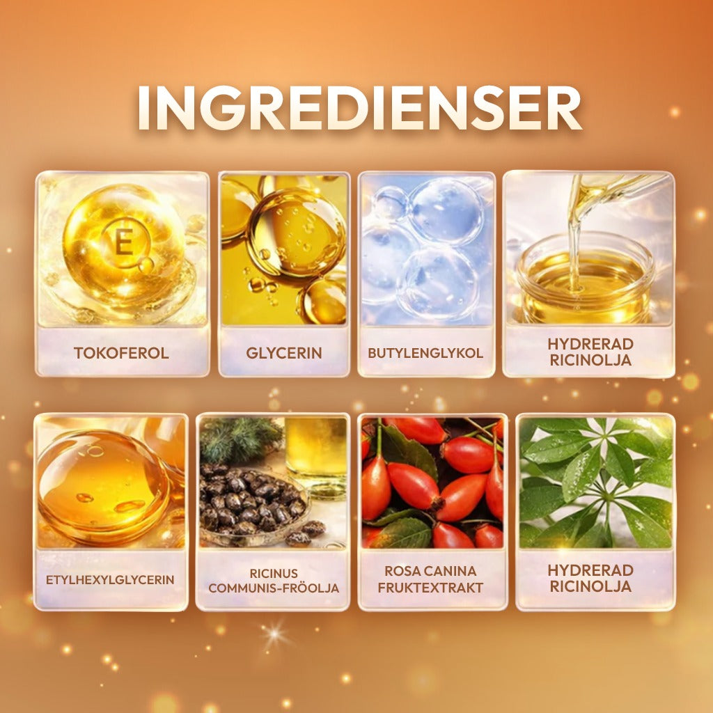 100% ekologisk och kallpressad med 93% ricinolsyra (marknadens högsta halt), förpackad i bärnstensfärgat glas av farmaceutisk kvalitet.