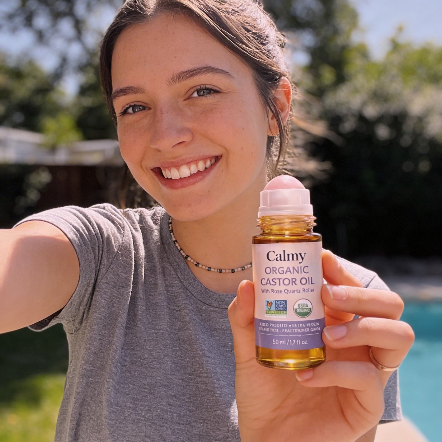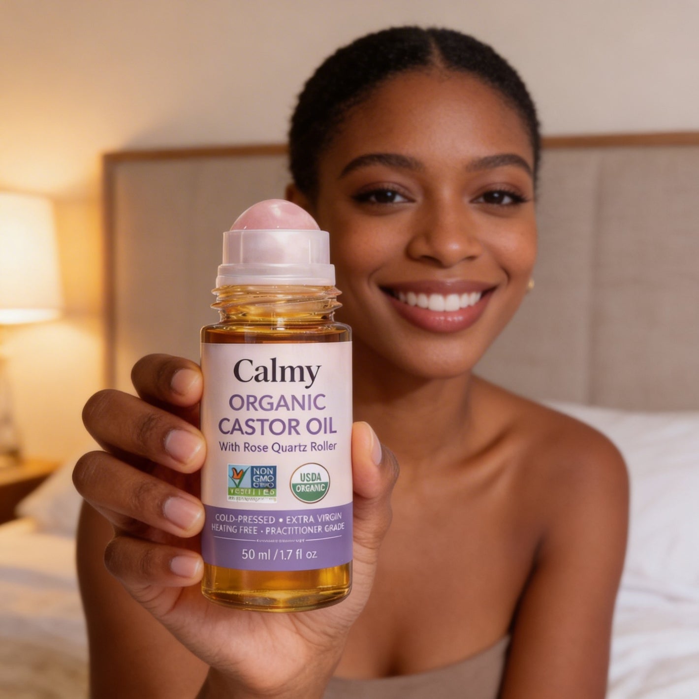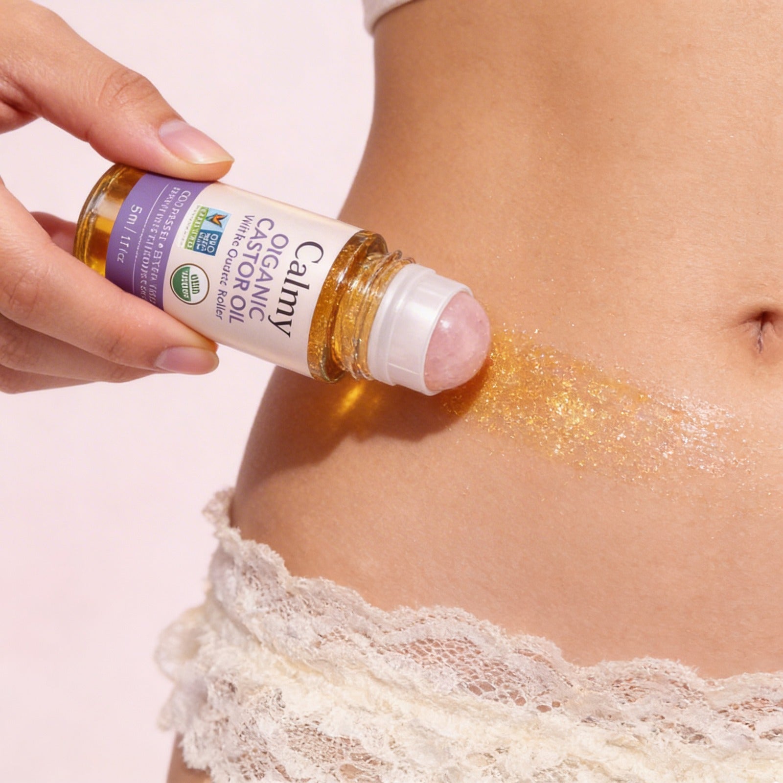 Bara ren, ekologisk, kallpressad ricinolja i glas av farmaceutisk kvalitet – med en exklusiv rosenkvartsroller.
